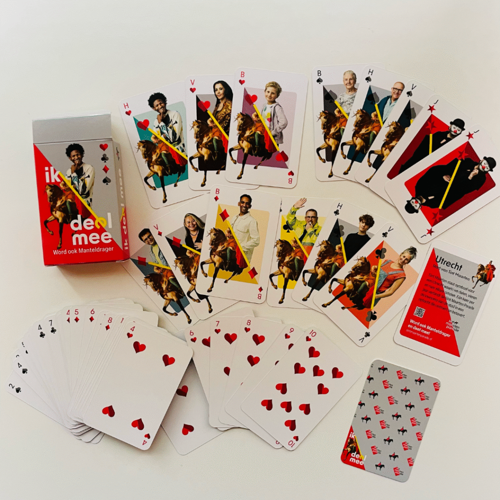Deze bijzondere speelkaarten zijn ontworpen in het teken van ‘Ik deel mee’. Met herkenbare gezichten van Utrechters als boer, vrouw en heer, en een krachtige boodschap.